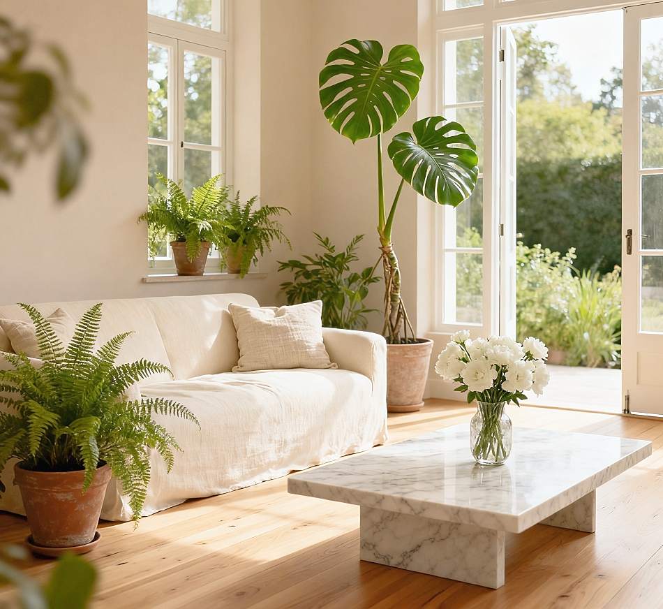 – Plantas purificadoras. Especies como la palma areca, el potos o el espatifilo ayudan a absorber toxinas y aportan frescura natural.